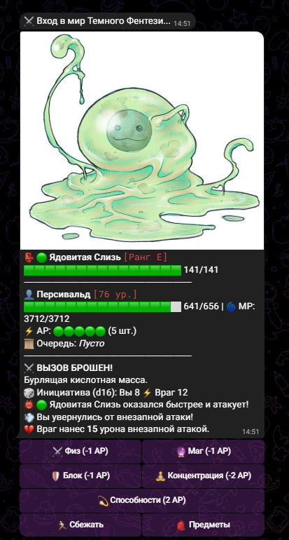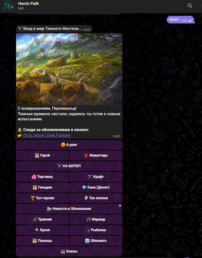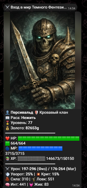 Полноценная, глубокая ролевая игра, работающая прямо в мессенджере. Мир погрузился во тьму, и игроку предстоит выбрать свой путь, чтобы выжить. Это не просто «кликер», а комплексная RPG с тактическими боями, экономикой и социальным взаимодействием.